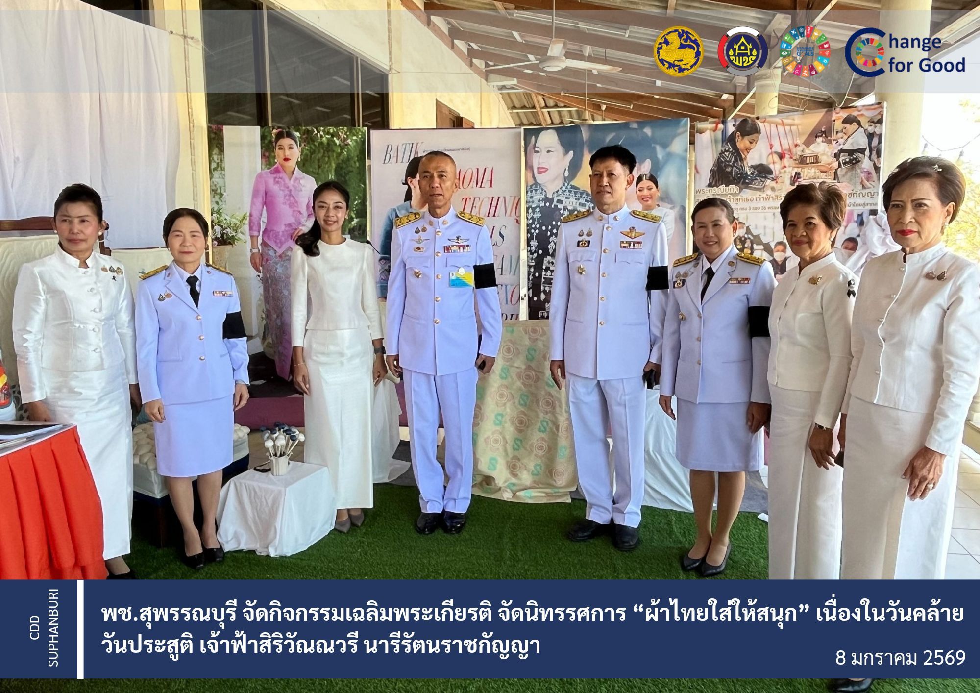 สำนักงานพัฒนาชุมชนจังหวัดสุพรรณบุรี โดย นางเอกหทัย พนมอุปถัมภ์ พัฒนาการจังหวัดสุพรรณบุรี พร้อมด้วยข้าราชการและเจ้าหน้าที่ จัดนิทรรศการเฉลิมพระเกียรติ "ผ้าไทยใส่ให้สนุก" เนื่องในโอกาสวันคล้ายวันประสูติ สมเด็จพระเจ้าลูกเธอ เจ้าฟ้าสิริวัณณวรี นารีรัตนราชกัญญา 8 มกราคม 2569